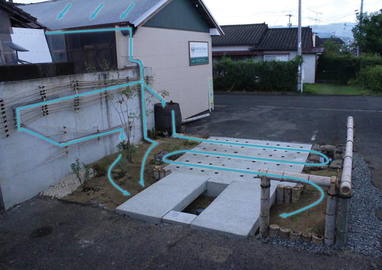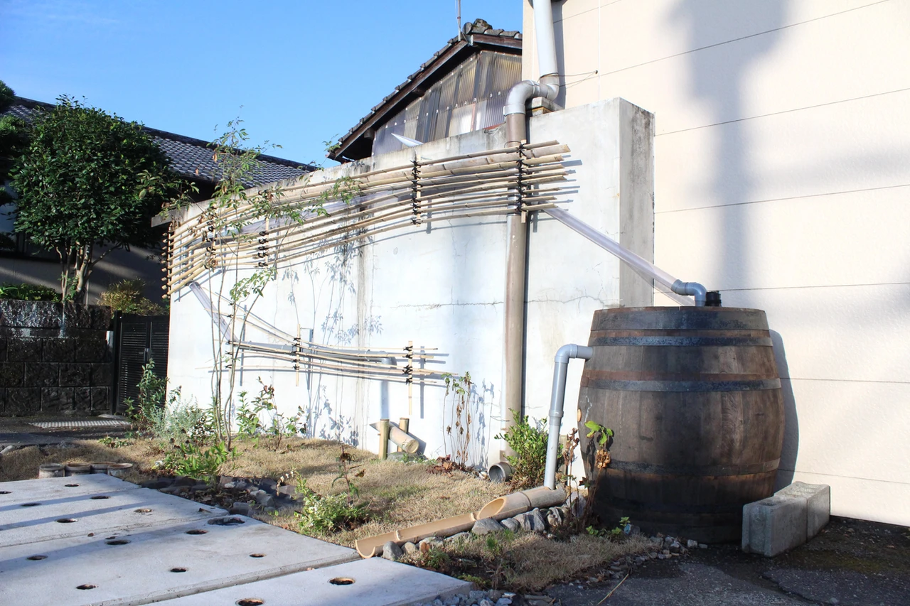 途中には、焼酎の樽を再利用した雨水タンクや、透明なパイプがあり、水の流れが見えるよう工夫されていて、竹で囲まれた水の道はまるで小さな川のよう。