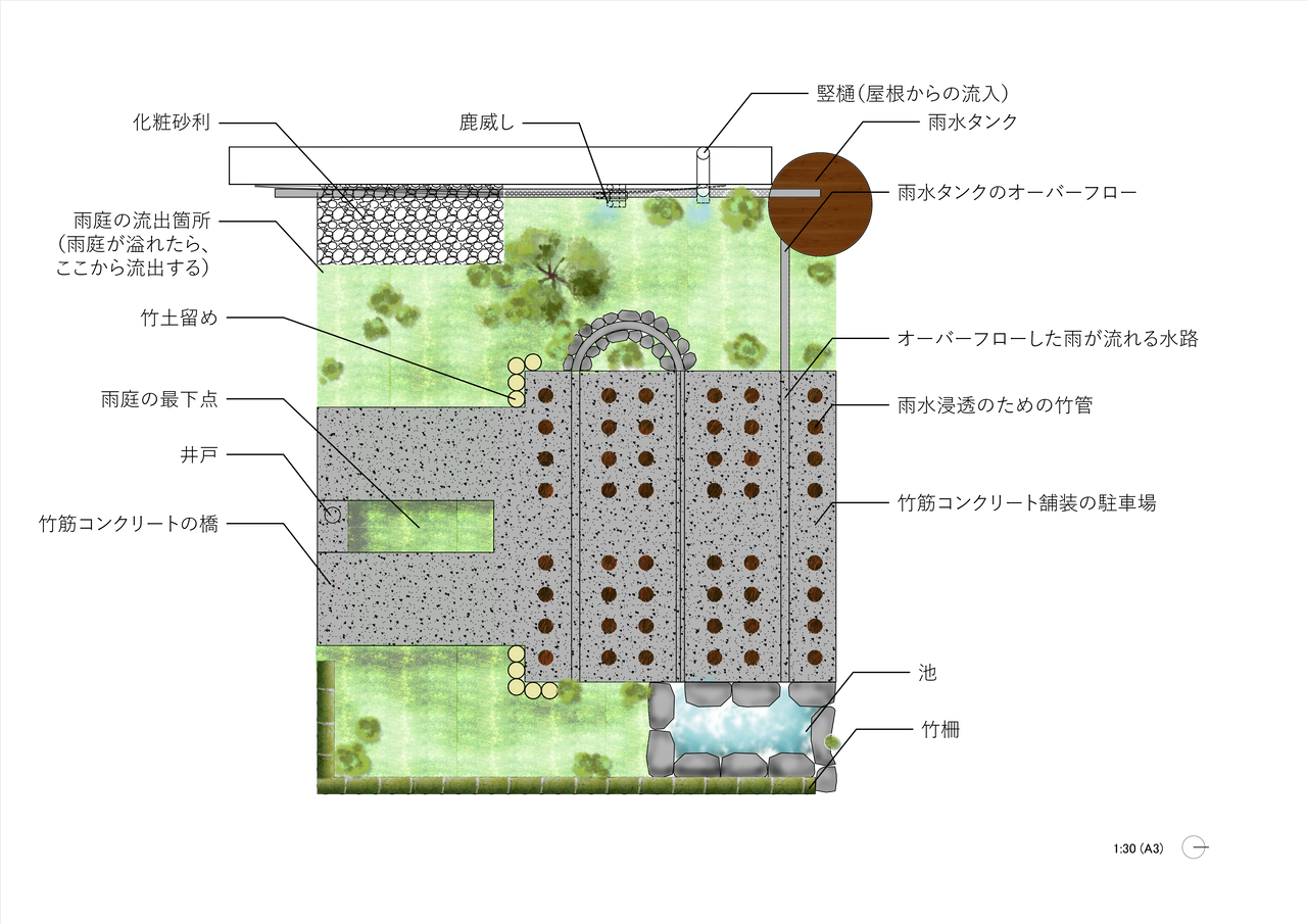 雨庭に使う竹筋コンクリートは、鉄筋より安価で、地元の竹を活用できるためコストを抑えながら環境にもやさしい素材。