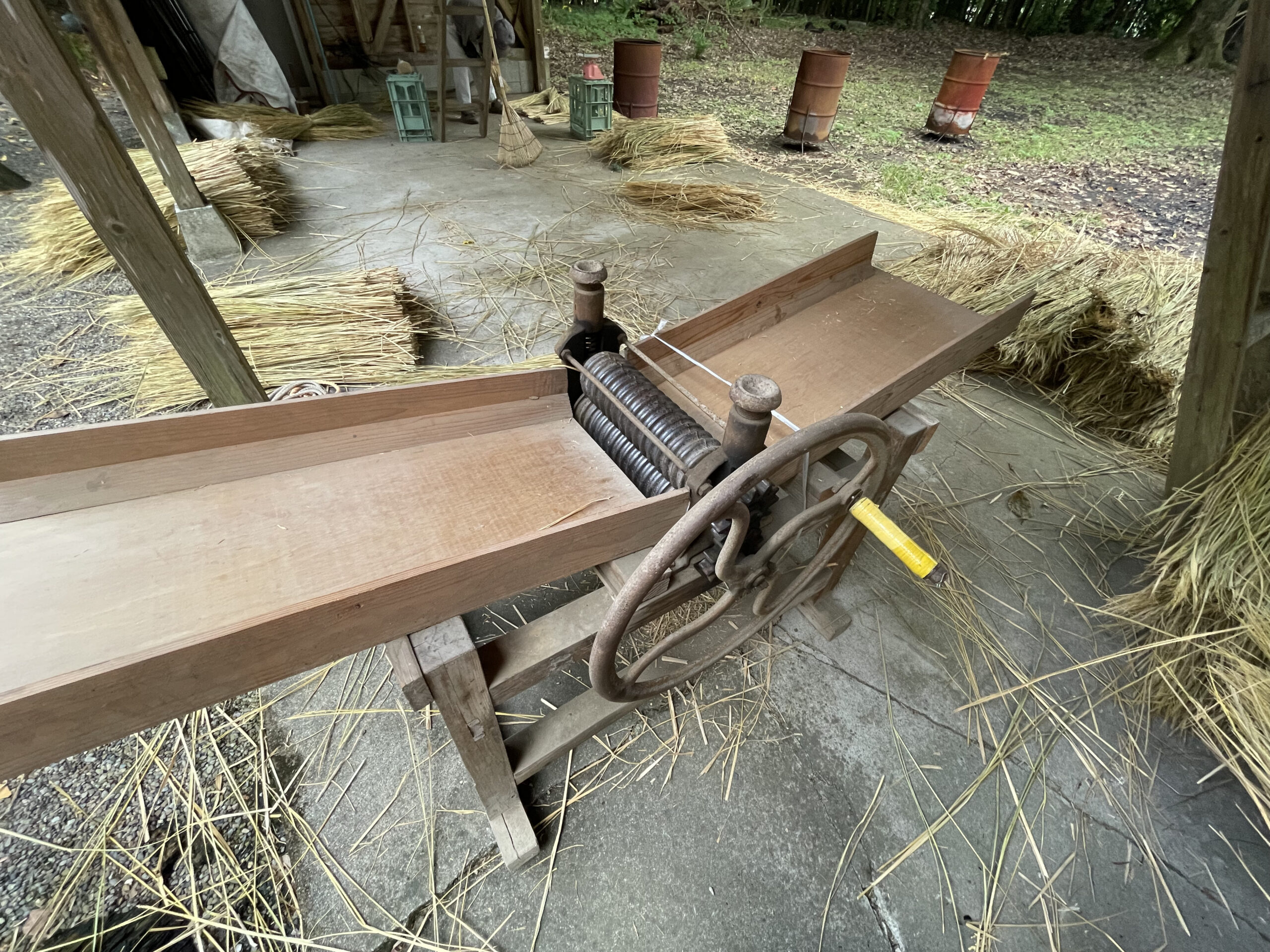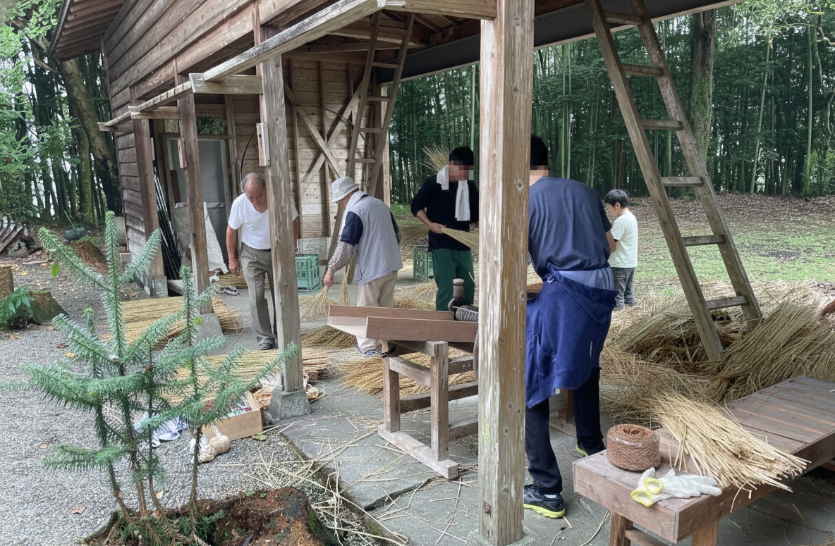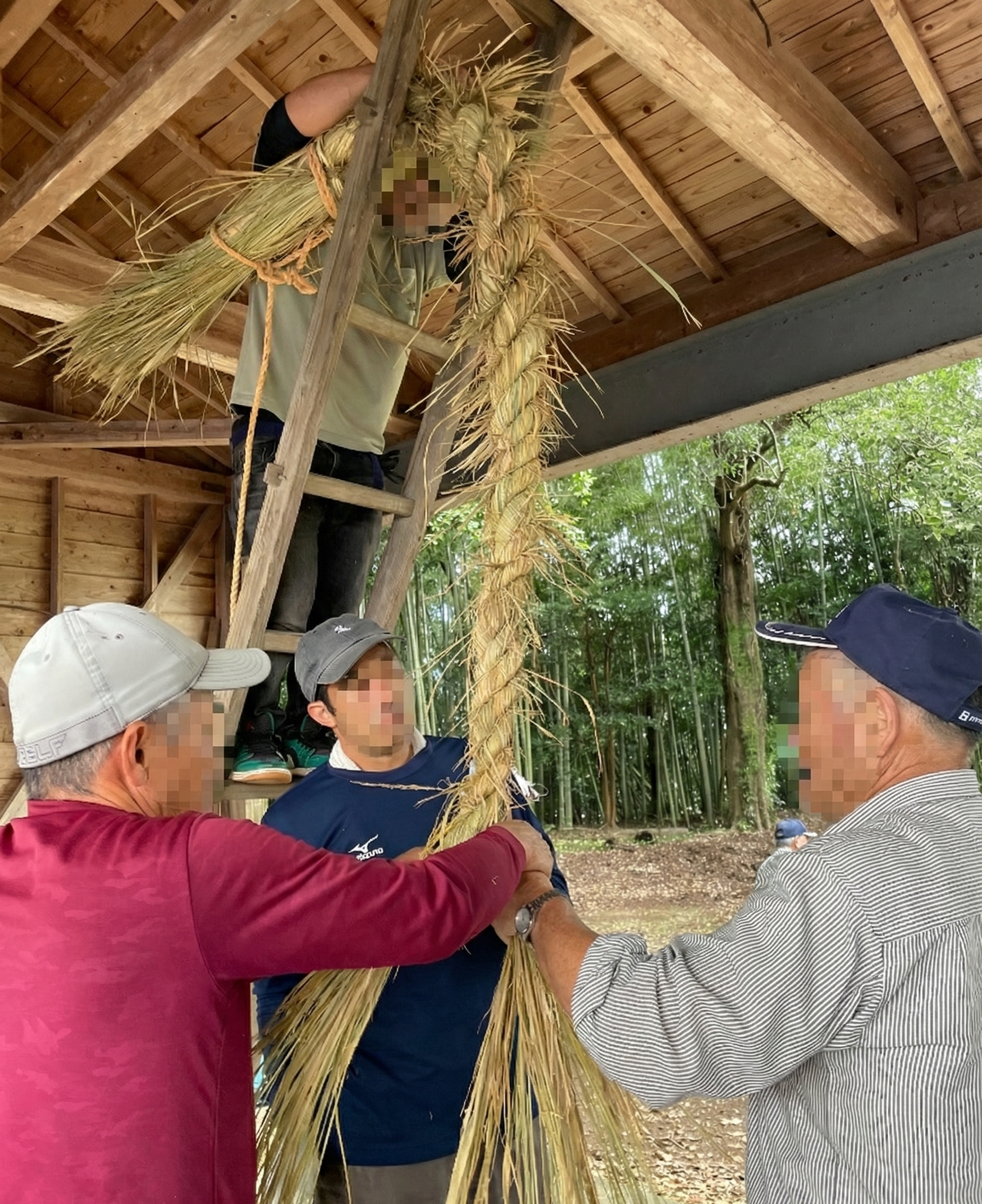 10月から11月にかけて、あさぎり町では地域の人々が集まり、近くの神社でしめ縄づくりを行います。