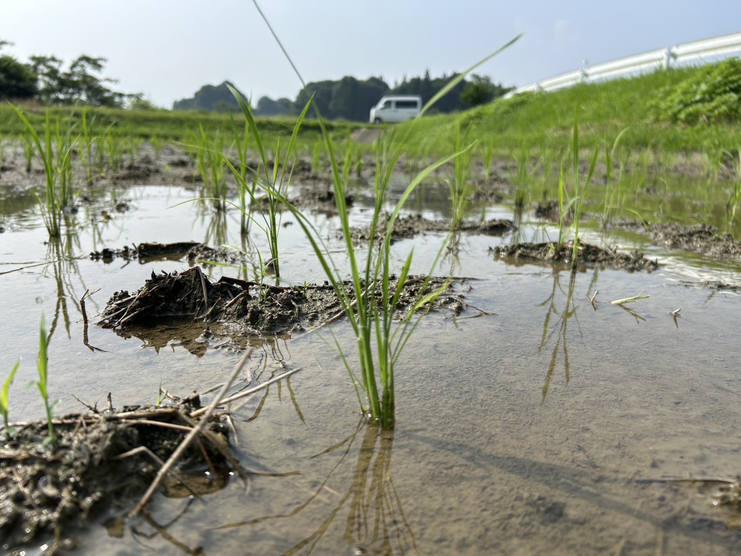 田んぼには、1〜2本ずつ手植えしました。(少しピントがずれてますが…)