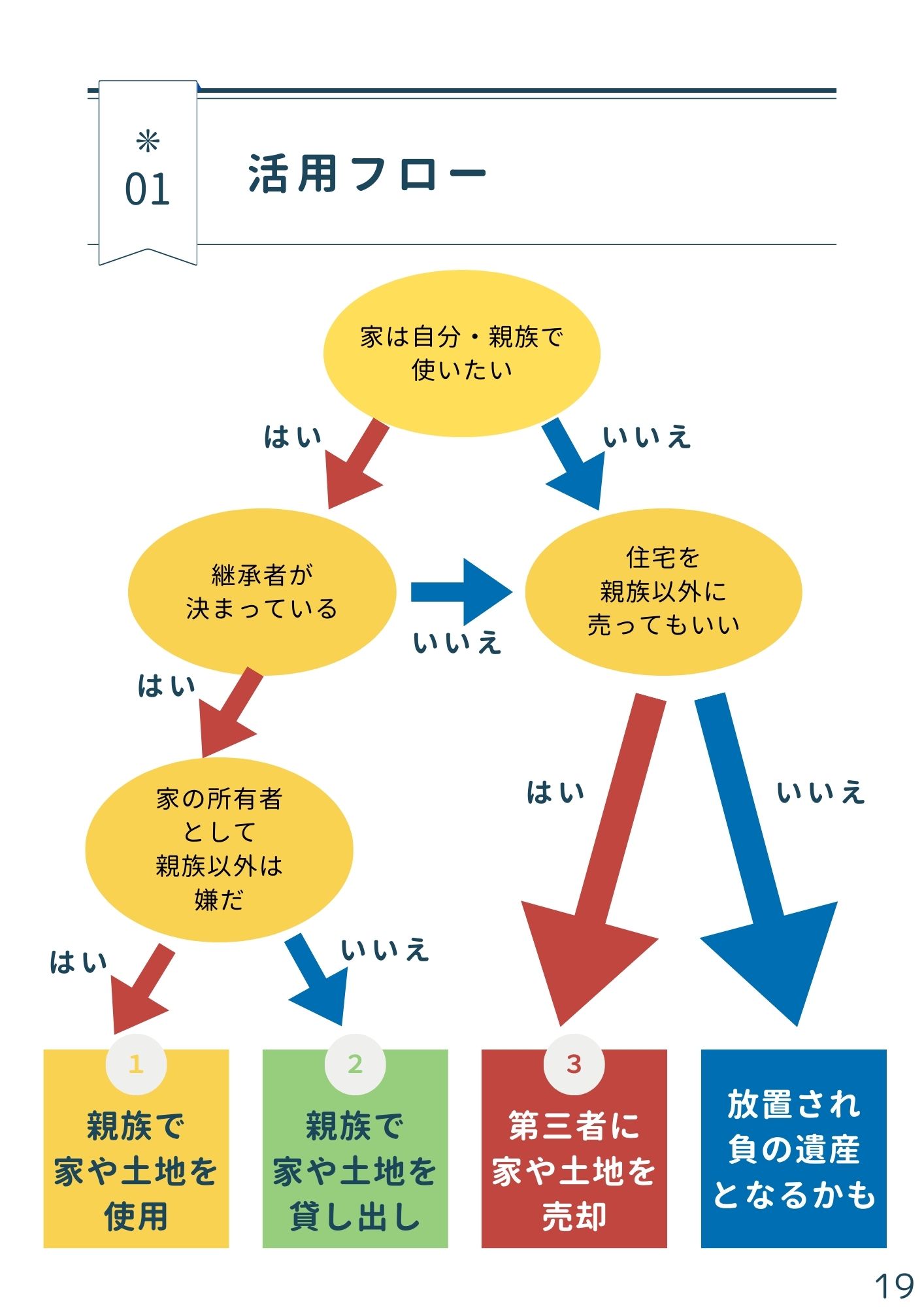 「誰に引き継ぐか」だけでなく「どう使うか」を検討します 。親族で使うのか、第三者に貸す・売るのか、判断を助けるフローチャートを掲載しています 。