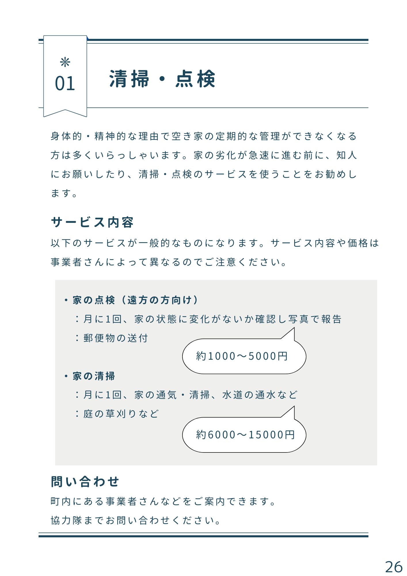 ・清掃・管理サービス:遠方の方向けの点検代行(月1,000円〜)や清掃代行を紹介しています 。