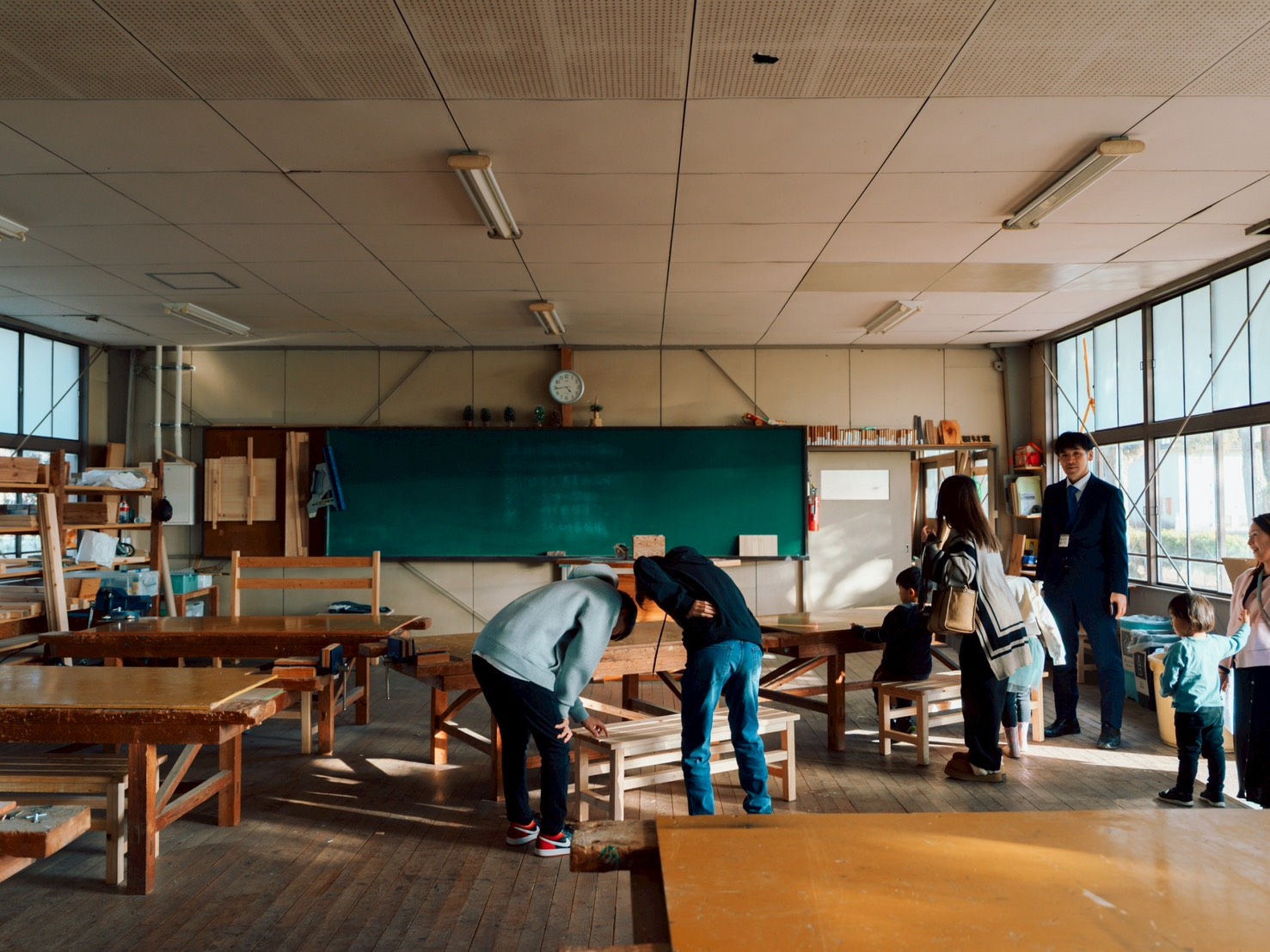 木工の見学では、近隣の山から木を運び出すところからものづくりが始まることを教えていただきました。教室には普段なかなか目にすることのない立派な加工機も並び、ご家族の皆さんも興味深そうに見学されていました。